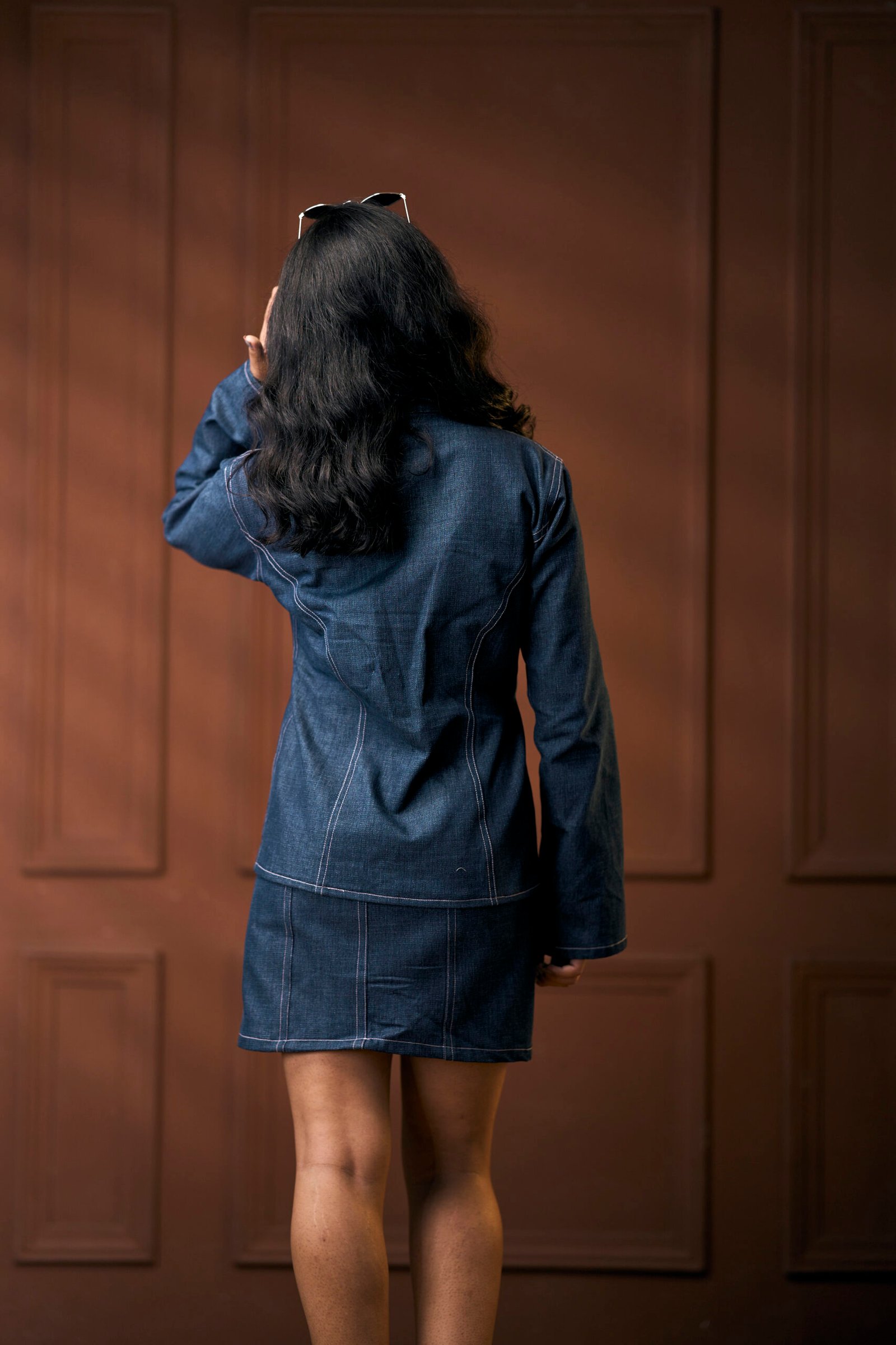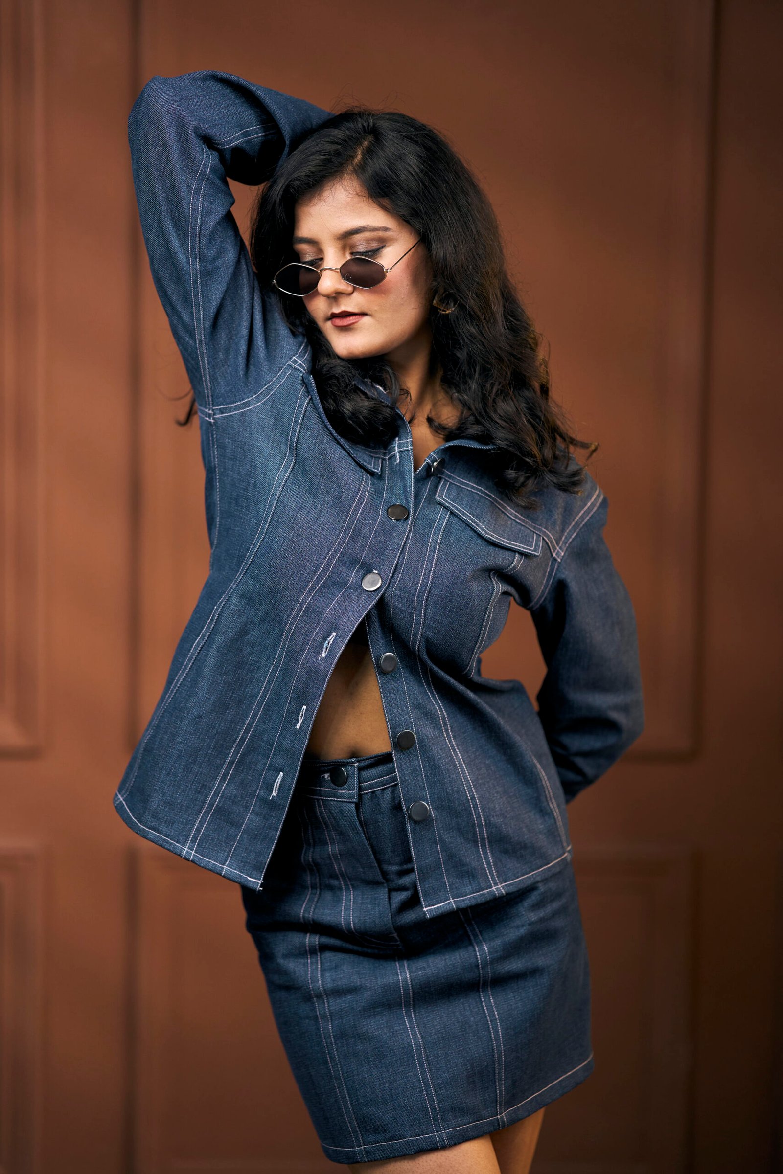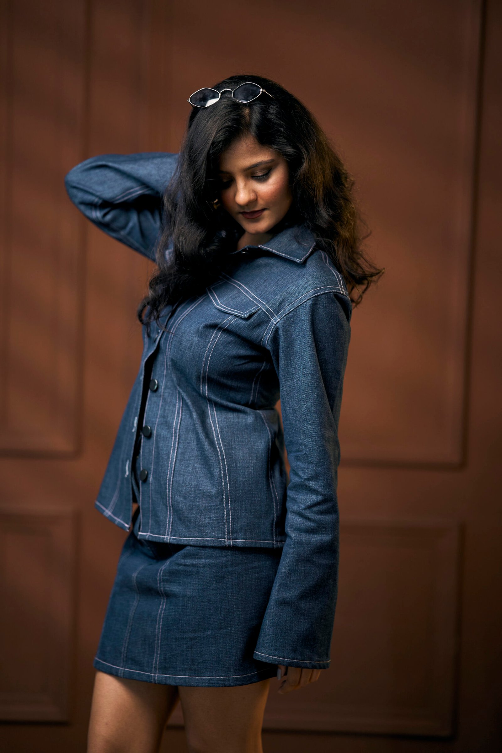 “Cinched in all the right places, this denim bell-sleeve shirt brings structure, style, and a hint of sass — with contrast pink stitching that makes it anything but basic.”