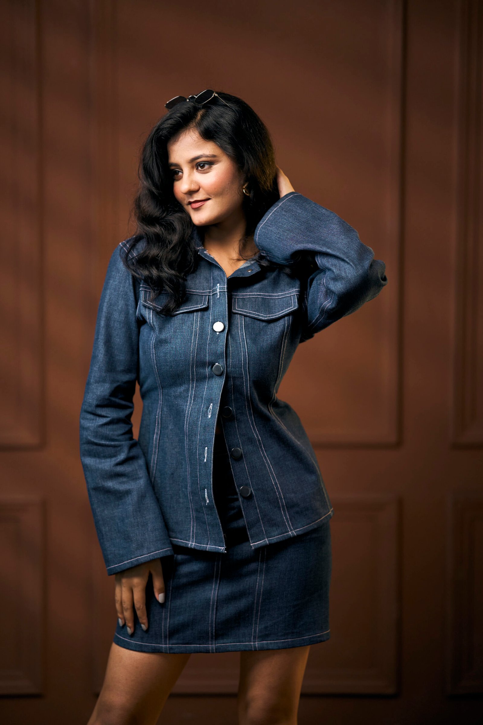 “A modern denim dream — this cinched shirt with statement bell sleeves pairs effortlessly with its panelled mini skirt. The contrast pink stitching adds a playful pop, while structured panels sculpt a flattering fit. Equal parts bold and versatile, it’s denim redefined.”