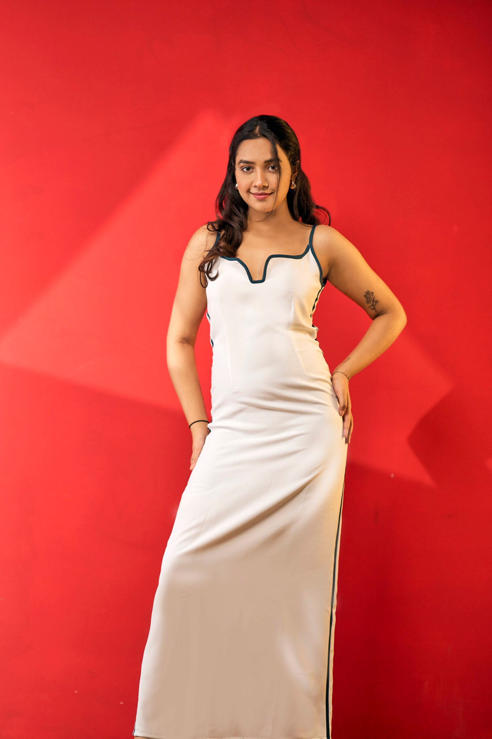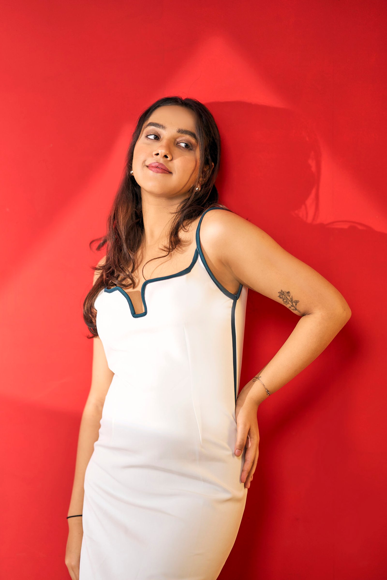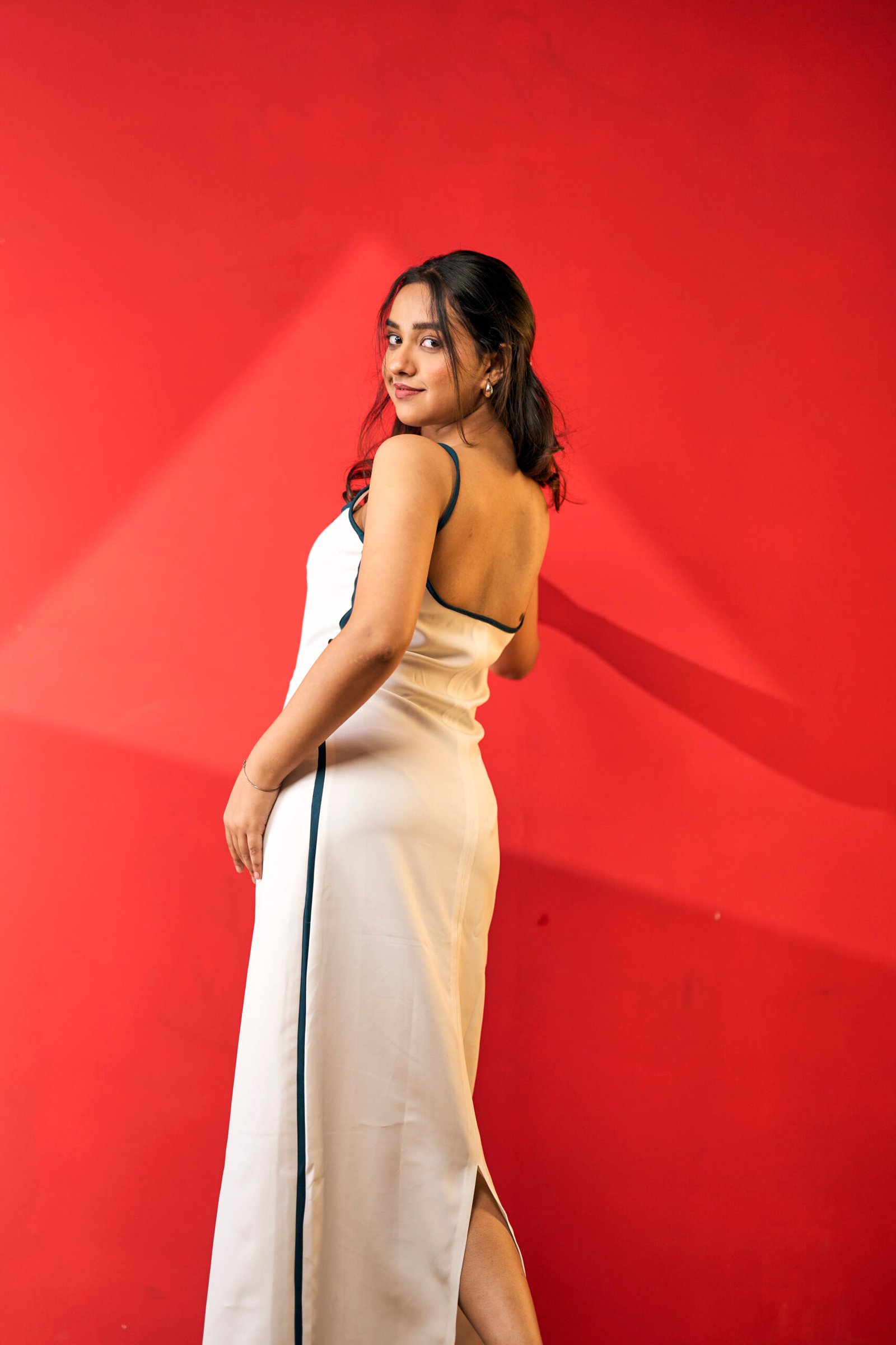 “Sleek and chic with a pop of teal, this dress hugs every curve and slays with a daring back slit. Effortlessly bold, totally unforgettable.”