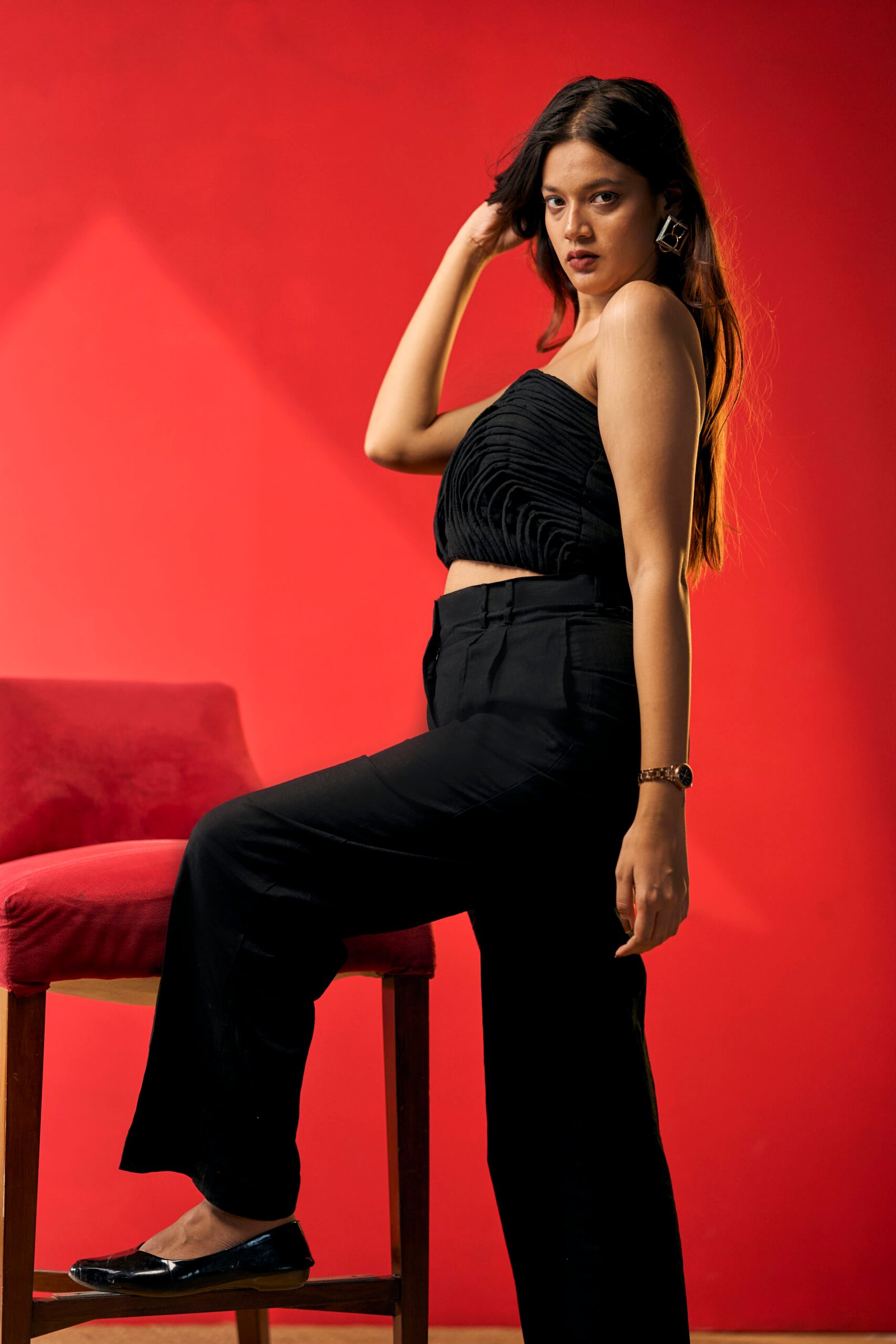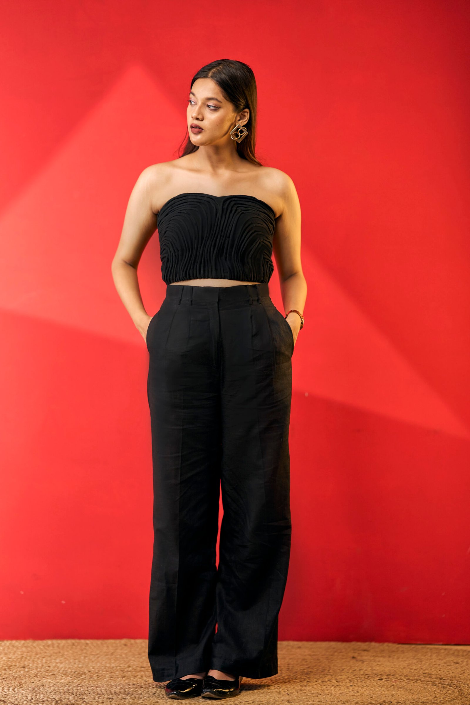 This all–black co-ord is the definition of understated glam—featuring a sculpted strapless top , with each string hand stitched on it , paired with pleated linen trousers and side pockets, it blends sharp tailoring with effortless elegance.