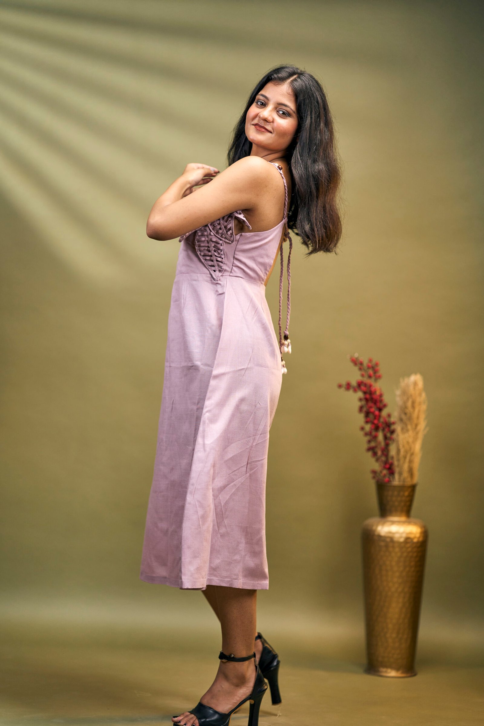 This one’s a flirt in linen. With delicately crafted petal appliqués blooming across the neckline and a half-lined yoke for that breezy comfort, it’s giving soft and bold. Turn around and it’s all drama — a braided tie-back with shell tassels and a peek of skin that says summer’s not over yet.