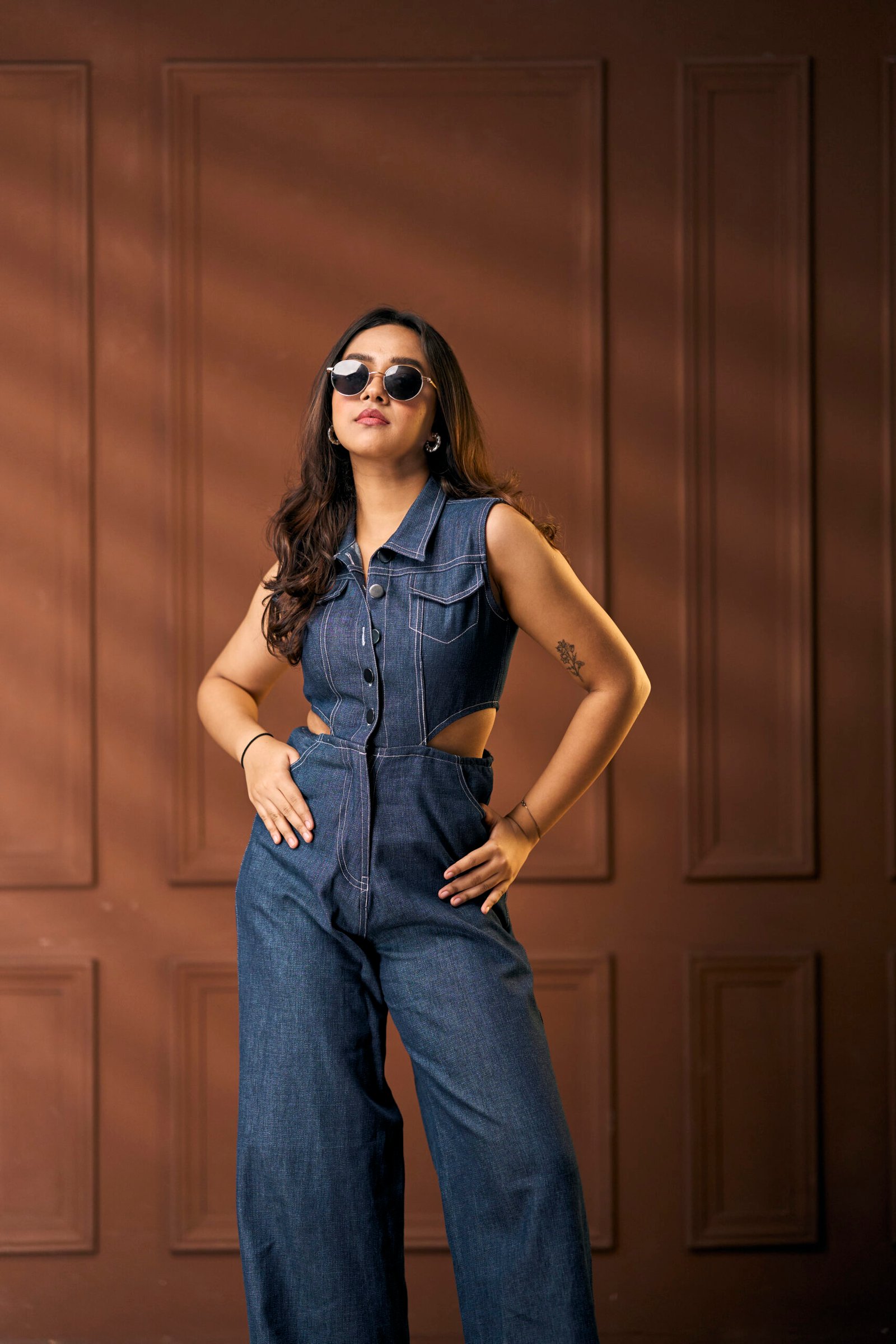 “Serving legs, attitude, and a whole lot of denim drama — this wide-leg jumpsuit comes with cheeky side cuts, pink-thread sass, and pockets that mean business (front and back, babe). The collared neckline adds a dash of boss energy, because why be subtle when you can slay in style?”