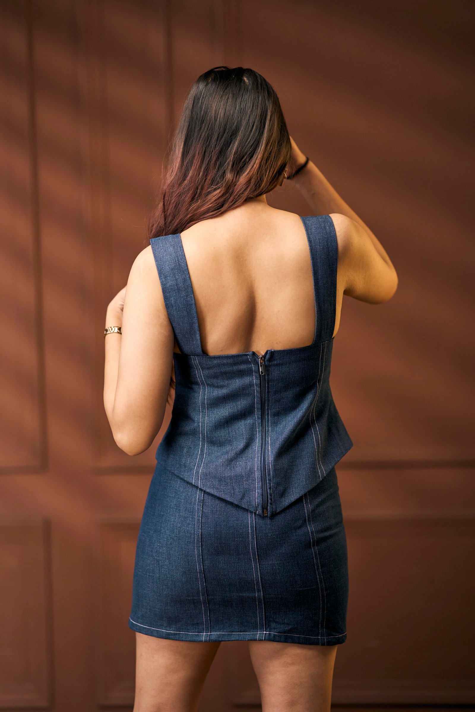 “Chic and subtly playful, this paneled denim skirt features delicate pink thread detailing that adds just a whisper of contrast against its deep indigo fabric. Tailored for a flattering fit, the clean lines and structured panels make it versatile for both casual days and dressier evenings.”